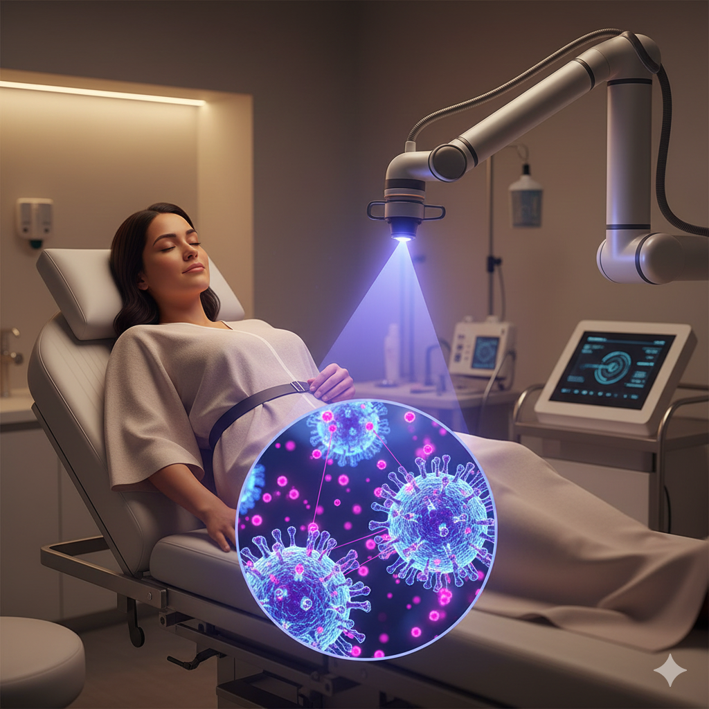 ¿Cómo funciona?: Se aplica un fármaco en el cuello del útero que se vuelve sensible a la luz; posteriormente, se irradia con un láser especial que elimina selectivamente solo las células infectadas por el virus.